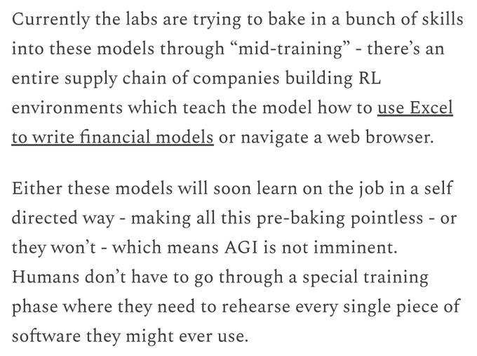 Dwarkesh Patel’s new essay "Thoughts on AI progress (Dec 2025)" argues he’s moderately bearish on near‑term AI impact because reinforcement learning from human or verifier feedback (RLVR) doesn’t scale cleanly the way pretraining does ai progress blog. He suggests some agentic skills—like reliable web nav or spreadsheet work—may need orders of magnitude more data and compute (he speculates up to 1,000,000×) before they feel like true workers rather than brittle demos.