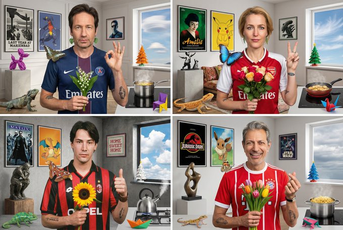 They pair it with a 2×2 grid prompt that asks the model to generate the original scene in the top‑left and then three variations where every item is slightly changed (different person, team kit, animal, posters, etc.), which really stresses whether the model followed the spec. (duchovny prompt, grid results) For art directors and prompt‑writers, this is a ready‑made workflow: write the brief as a checklist, then confirm each box is visually present before delivering or iterating, especially on campaigns with lots of tiny required elements (brands, easter eggs, legal must‑haves). It’s a small thing, but it turns fuzzy “does this match the prompt?” debates into something you can actually audit.