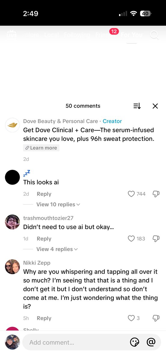 The dynamic shows up concretely in brand comments—one example screenshot shows a top reply of “This looks ai” with 744 likes on a Dove post, as captured in the Detectability argument.