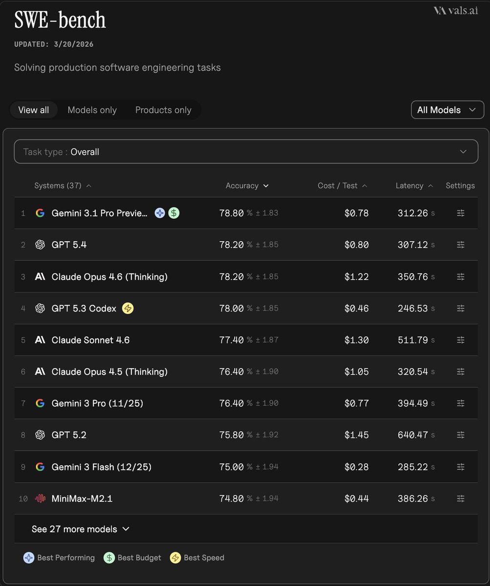Vals AI switched SWE-Bench Verified from SWE-Agent to the bash-only mini-swe-agent harness, aligning results more closely with the official benchmark setup. Top score dipped slightly to 78.8%, but the change reduces harness-specific confounds when comparing models.