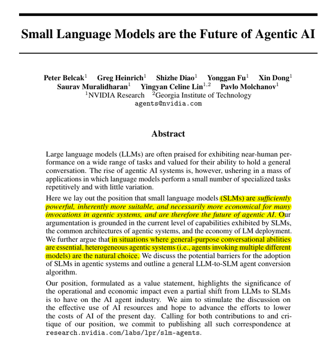 NVIDIA’s argument: agentic systems should be heterogeneous — small language models handle frequent, routine tool calls (10–30× cheaper to serve), while larger LLMs are invoked sparingly for complex reasoning; the paper maps conversion & fine‑tuning pipelines to operationalize SLMs in agent loops NVIDIA SLMs paper (summary) Retweet / buy‑in commentary.