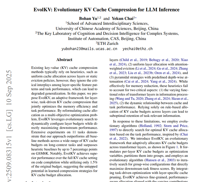 EvolKV treats KV cache compression as a multi‑objective search, evolving layer‑wise budgets to maximize task quality under strict memory caps. On code completion, it surpasses full‑cache performance while using only ~1.5% of memory; on GSM8K it retains up to 95.7% with much smaller budgets paper first page. Takeaway: fixed heuristics (e.g., pyramid or uniform per‑layer) leave performance on the table—learned allocations can deliver large memory savings at serving time.