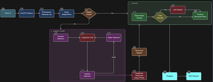 ParserGPT turns messy sites into structured CSV via a two‑stage flow: a LangGraph learner proposes/repairs CSS/XPath selectors, validates them, then saves an adapter for deterministic parsing; if a field is missing, it selectively falls back to an LLM flowchart. Adapters persist for repeat runs, outputting rows to Postgres/CSV with fewer brittle heuristics. Announced in context of News agent open‑sourced news synthesis with LangGraph, this pushes toward durable, maintainable RAG ingestion rather than ad‑hoc scraping.