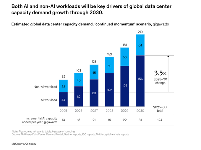 - McKinsey projects 156 GW data‑center capacity by 2030; ~$5.2T investment across the stack
