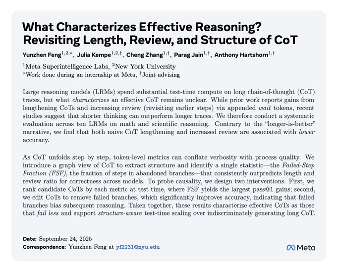 Longer chain‑of‑thought isn’t better. This study finds that longer traces and more review loops correlate with lower accuracy; instead, a clean structure with few abandoned branches predicts success. The authors introduce Failed‑Step Fraction (FSF) to score CoTs and show that ranking or editing by FSF improves results paper brief, with full details in paper page.