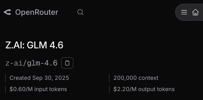 OpenRouter added GLM‑4.6, exposing provider routing, context controls (128k/200k), and a raised max output to 128k (default 64k). provider page