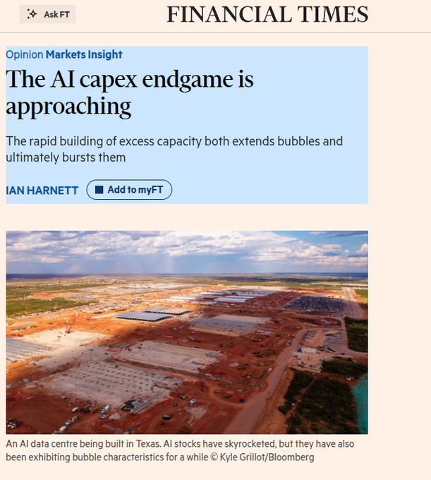 • Bubble phases often end when excess capacity meets demand air pockets; earnings can fall faster than capex can slow FT analysis.