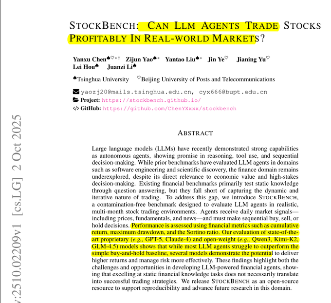 A new benchmark, StockBench, evaluates agents that trade using daily prices, fundamentals, and news—and finds sporadic wins but no reliable edge over equal‑weight buy‑and‑hold. It measures both return and risk (max drawdown, Sortino) and ablates inputs like news/fundamentals to probe signal value paper summary, and the full write‑up details inconsistent gains and added noise with larger portfolios ArXiv paper.
