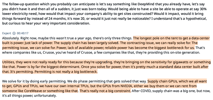 An executive transcript making the rounds states "Power, lack of available power, reliable power has become the biggest bottleneck for us," adding that the GPU/TPU supply chain is "really not a big constraint" compared to electricity exec transcript. The comment echoes a wider industry shift toward siting DCs where power and permits exist, not just where chips can be procured.