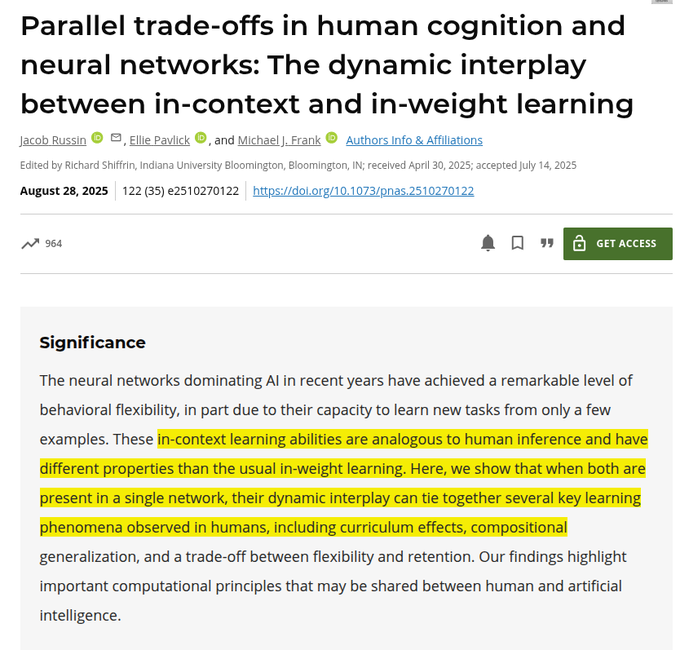 PNAS research connects LLM in‑context (fast, scratchpad‑like) and in‑weight (slow, lasting) learning to human working vs long‑term memory, showing curriculum effects and a flexibility‑retention trade‑off within one network after ~12k small tasks paper highlight.
