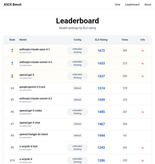 A new ASCII Bench leaderboard snapshot places Anthropics’s Claude Opus 4.1 at #1 with an Elo of 1,672 using an extended‑thinking configuration, edging out other frontier models on structured ASCII tasks leaderboard shot. The result underscores how chain‑of‑thought or “thinking” modes can materially shift creative‑format leaderboards even without parameter changes.
