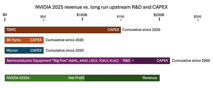 - Revenue vs supply chain: Nvidia’s ~$200B 2025e revenue stacks against decades of upstream R&D+CapEx across equipment makers; authors frame a “CapEx overhang” that can fund more fabs buildout thread.