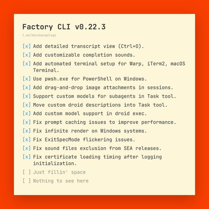 Factory CLI v0.22.3 ships stability fixes and smoother I/O for agent sessions