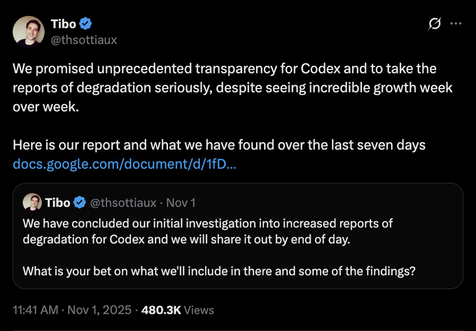 OpenAI’s Codex team published findings from a week‑long degradation probe: they cleaned up problematic hardware, fixed compaction issues, improved patching logic, squashed sampling/latency bugs, and removed 60+ feature flags. Codex also helped debug itself, and further hardening is underway investigation summary, following up on performance deep‑dive that outlined the initial probe.