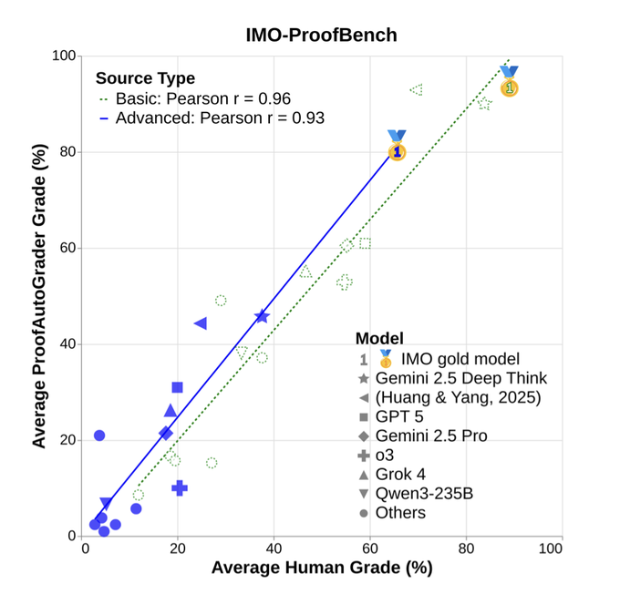IMO‑Bench’s AnswerAutoGrader extracts a single final answer and judges semantic equivalence, reaching 98.9% agreement with human graders on positives; the proof autograder correlates tightly with human scores on both basic and advanced sets grading details, proof grader chart. Robustified problems consistently reduce accuracy across models, signaling lower memorization risk in evaluation design ArXiv paper.