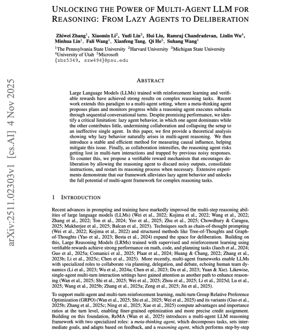A multi‑agent analysis finds common collapse where one agent does all the work; Dr. MAMR mitigates it using a Shapley‑style causal influence metric plus an explicit restart/deliberation action that prunes noisy steps and re‑plans paper thread.