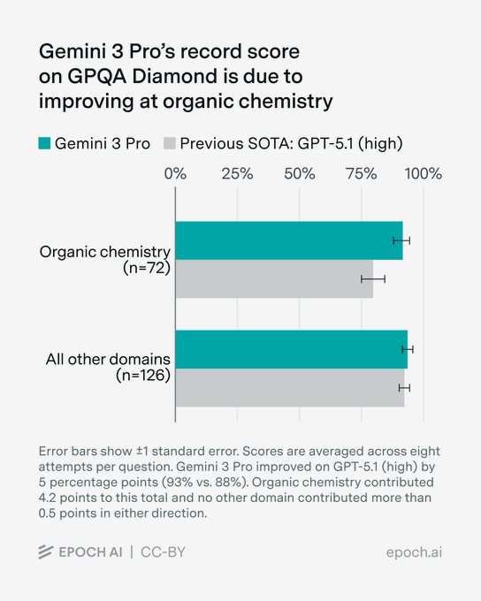 Gemini 3 Pro set a new record on the GPQA Diamond benchmark with a 93% score, up from the previous best of around 88% from GPT‑5.1 (high), with most of the gain coming from organic chemistry questions. gpqa update