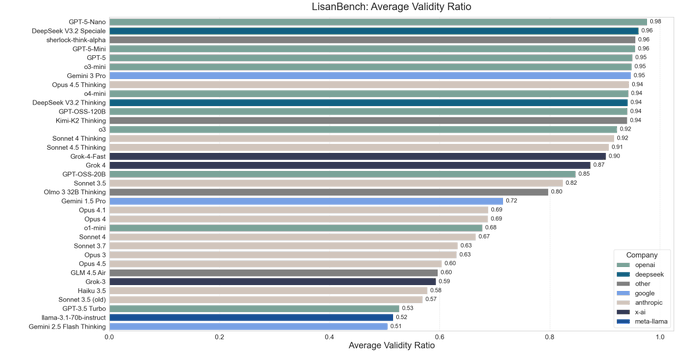 LisanBench crowns DeepSeek V3.2 Speciale as top open non‑Anthropic reasoner