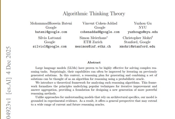 A new "Algorithmic Thinking Theory" paper treats multi-step LLM reasoning as an algorithm designing and recombining earlier attempts, instead of just doing best‑of‑k sampling. It shows that branching trees, genetic-style recombination, and random resampling can all converge to an optimal success probability under a simple oracle model where past answers are tagged as correct/incorrect and fed back in context. paper thread