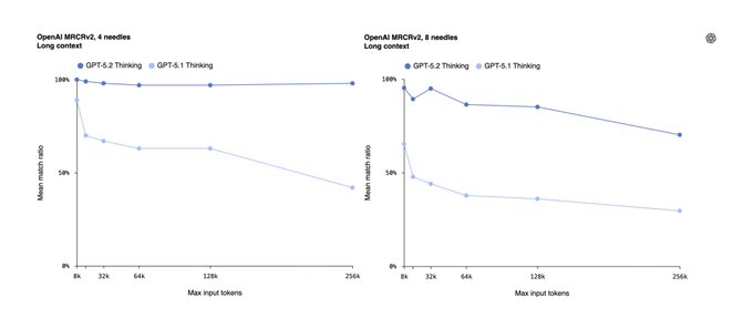 On OpenAI’s MRCRv2 “needle in a haystack” eval, GPT‑5.2 Thinking stays near‑perfect on 4‑needle setups all the way out to 128k–256k tokens, and remains very strong on 8‑needle tests, while GPT‑5.1’s accuracy collapses as context grows. (4-needle chart, 8-needle chart) The official charts show GPT‑5.1 Thinking’s mean match ratio falling from ~80% at 8k tokens to ~40% by 256k, whereas GPT‑5.2 Thinking’s curve barely moves, hugging the 90–100% band across the same range.