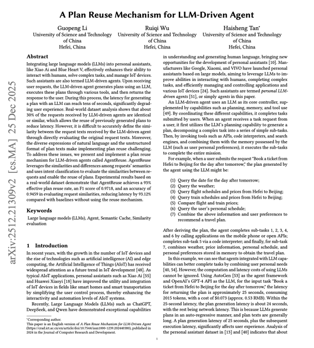 AgentReuse (USTC): A new plan‑reuse mechanism for LLM agents separates task intent from parameters, caches prior step‑by‑step plans, and re‑injects fresh arguments for semantically similar tasks, achieving a 93% effective plan reuse rate and cutting latency by 93.12% vs. no caching on 2,664 real agent requests according to the agentreuse summary and the ArXiv paper. The system adds under 100MB of extra VRAM and ~10ms overhead per request yet still beats response‑level caches like GPTCache by 60.61% on latency, because it reuses structured plan skeletons while re‑executing tools for up‑to‑date answers.