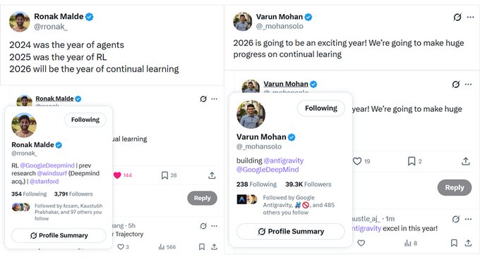 Continual learning 2026 (multi‑lab): Multiple prominent researchers and commentators are now labeling 2026 as the turning point when continual learning—models that update after deployment instead of waiting for big retrains—starts to become practical at scale; Google DeepMind researchers Ronak Malde and Varun Mohan both say "2026 will be the year of continual learning" and expect "huge progress" there, echoing earlier comments from Anthropic’s Dario Amodei about continual learning being "solved" or at least becoming workable by 2026 deepmind posts and leaders list. The Information’s 2026 outlook goes further by predicting that a breakthrough in continual learning could push AI compute usage toward "100% inference and basically 0% training," even speculating this might hurt Nvidia’s stock, while analysts like Rohan Paul push back that continual learning still needs frequent fine‑tuning, evals and safety checks, so it likely shifts rather than erases training demand information summary and nvidia take. Teknium adds that any genuine continual learning scheme must still involve weight updates—"otherwise it hasn’t learned anything"—and warns that naive batch‑size‑1 updates risk overfitting, underscoring that the exact algorithms and architectures behind practical continual learning are still an open question training comment.