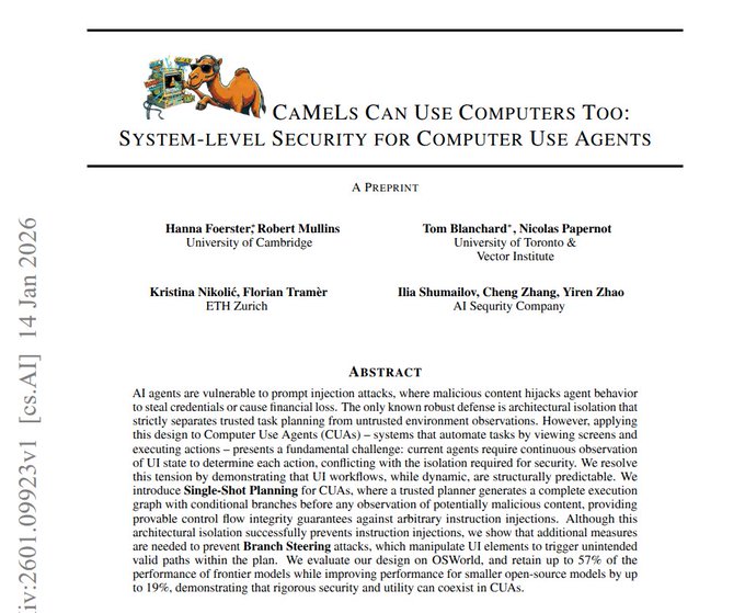 CaMeLs computer-use security (arXiv): A new design pattern for computer-use agents splits a trusted planner from an untrusted screen-reading executor, forcing the plan to be written before the model sees the screen—aiming to prevent on-screen prompt injection from rewriting intent, as summarized in the [paper thread](t:243|paper thread).