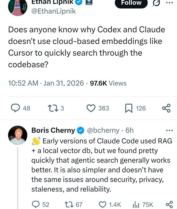 Claude Code (Anthropic): An internal architecture note is being recirculated: early Claude Code builds used RAG plus a local vector DB, but the team found that “agentic search generation” worked better and shifted away from that setup, as quoted in the Architecture note.