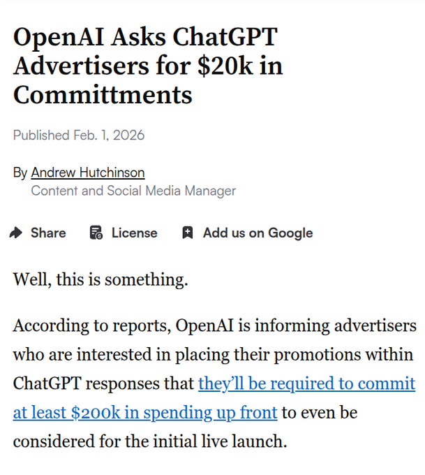 ChatGPT ads beta (OpenAI): OpenAI is reportedly asking prospective advertisers for at least $200,000 in upfront commitments to join its initial ChatGPT ads beta, with promoted posts appearing at the bottom of responses and “not influencing answers,” according to the ad beta details.