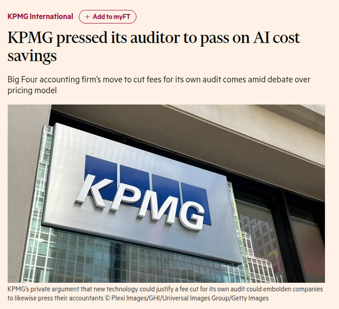Audit pricing pressure: FT anecdote says KPMG forced a 14% fee drop to $357,000 (from $416,000) as AI compresses audit workflow labor, with judgment still positioned as partner-level.