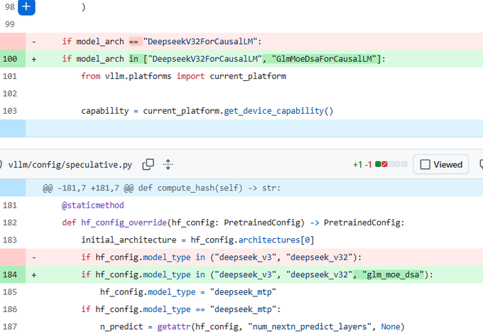 The concrete plumbing change is that vLLM now treats GLM’s glm_moe_dsa model_type alongside DeepSeek’s v3/v3.2 families in speculative/config override logic (routing it through DeepSeek MTP-related configuration), as shown in the diff snippet. The same tweet thread also claims the architecture matches DeepSeek-V3.2’s sparse attention + multi-token prediction setup and notes “no multimodal support spotted,” per the diff snippet—treat that as a code-reading inference, not an official model card.