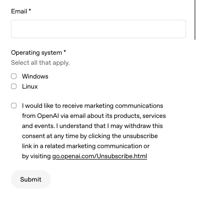 Codex Alpha app (OpenAI): An early access waitlist for the Codex Alpha desktop app surfaced with Windows as a target OS and Linux also listed as an option, per the waitlist screenshot.