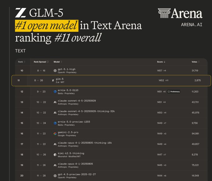 GLM‑5 (Arena): Arena reports GLM‑5 is now the #1 open model on the Text leaderboard and sits around #11 overall, with a displayed score near 1452 and a still-growing vote count, according to the leaderboard announcement and the screenshot in the rank evidence.