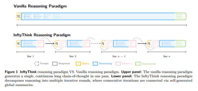 InftyThink+ (ZJU + Ant Group): A new reasoning-control strategy replaces one long chain-of-thought with iterative “think → summarize → continue” rounds, trained with a supervised cold start followed by trajectory-level RL; the loop structure is diagrammed in the Loop diagram thread.