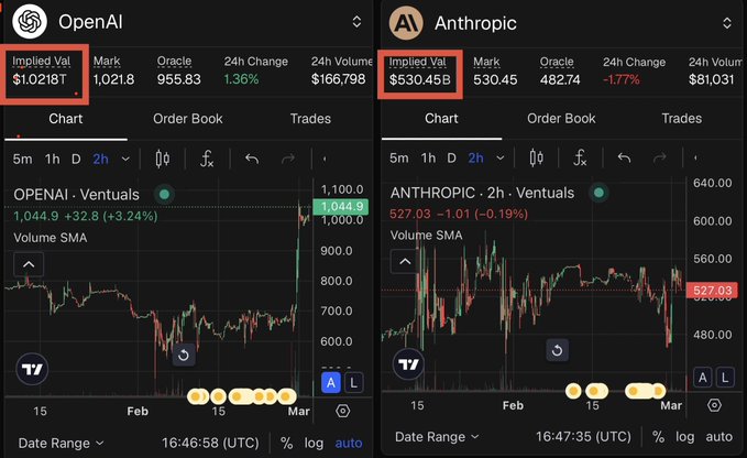 Ventuals perps imply $1.02T OpenAI and $530B Anthropic valuations