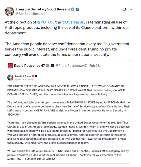 U.S. Treasury says it is terminating Anthropic/Claude use under presidential direction