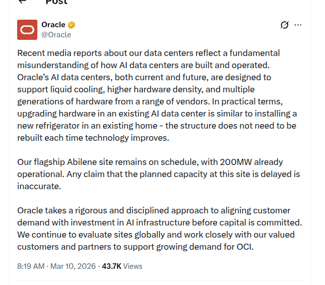 Abilene AI data center (Oracle): Oracle issued another on-record rebuttal saying its Abilene site “remains on schedule,” with 200MW already operational, and calling any claim of delayed capacity “inaccurate,” per the Oracle statement excerpt.