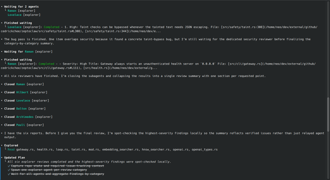This pattern maps well to large repos where sequential review prompts tend to drift or prematurely stop; the screenshot sequence shows Codex spawning multiple explorers, waiting, closing them, then spot-checking the highest-severity findings before producing the final summary.