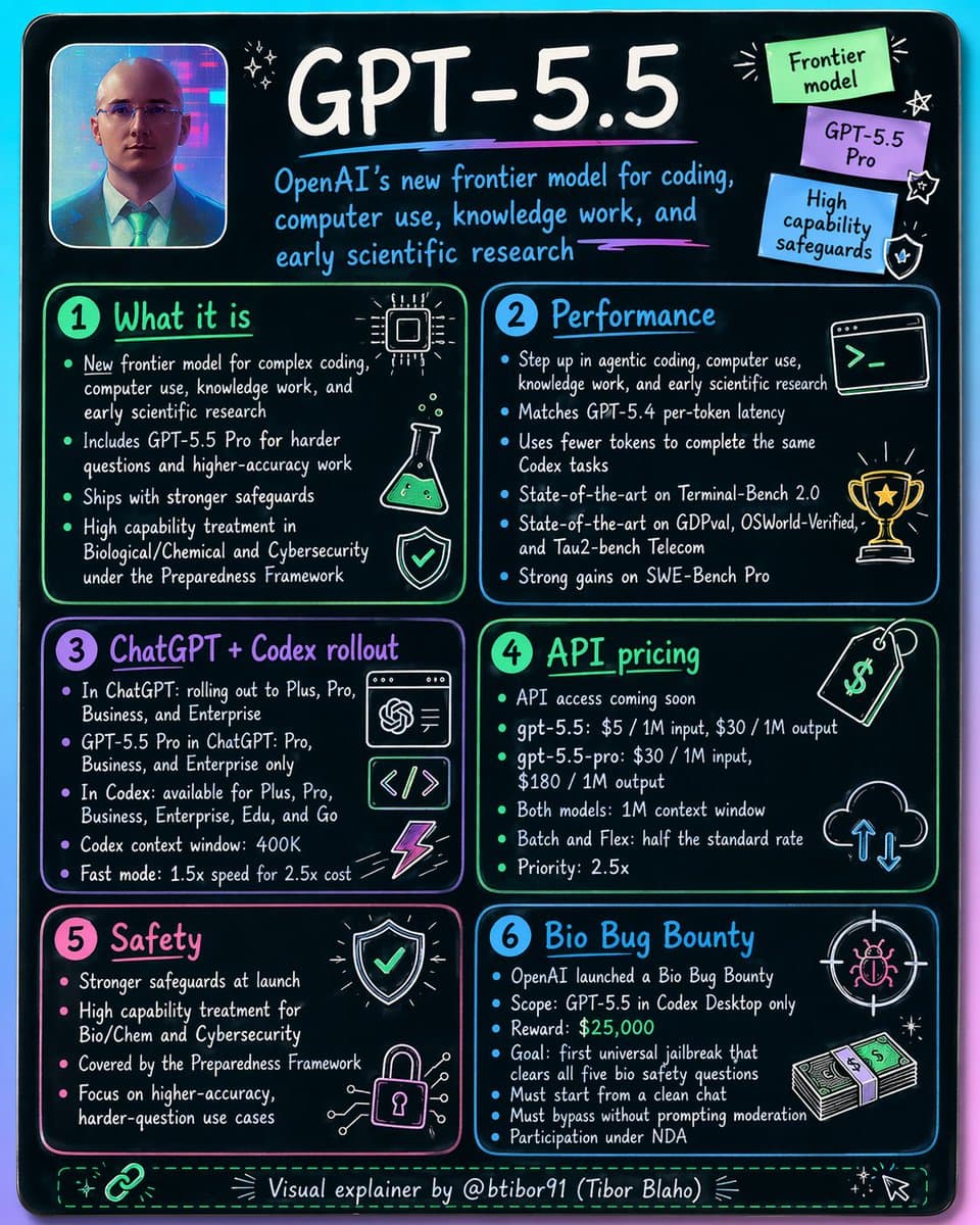 OpenAI rolled out GPT-5.5 and GPT-5.5 Pro in ChatGPT and Codex, with higher scores on terminal, OS, cyber, and math evals than GPT-5.4. Codex also gained browser, document, and computer-use features for longer agent workflows.