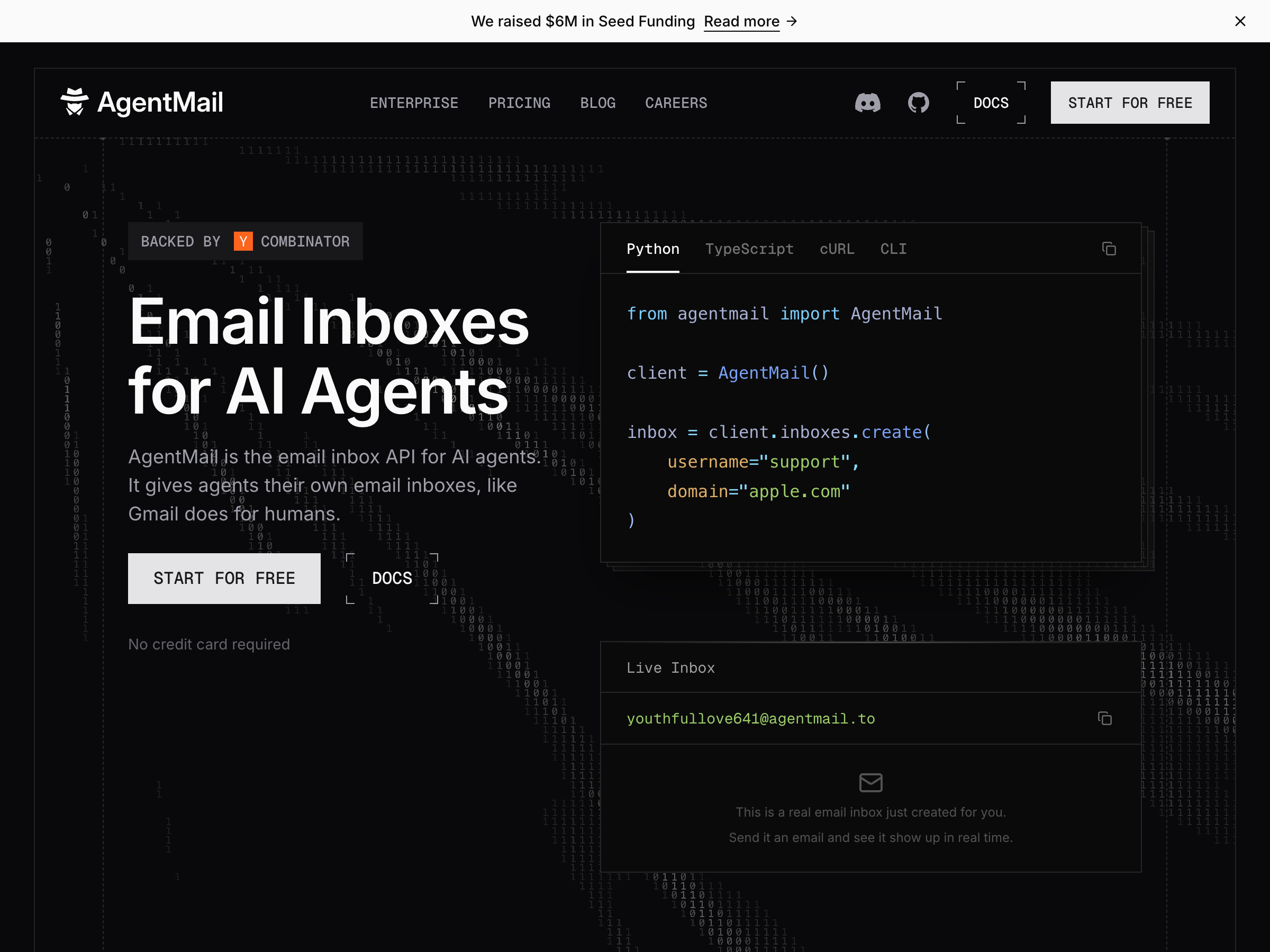 AgentMail is the email inbox API for AI agents — it gives each agent its own real email address the way Gmail does for humans. Builders provision inboxes in one API call (no domain verification), then send, receive, reply, parse attachments, and semantically search through threads via REST endpoints, typed SDKs, webhooks, and an MCP server. Y Combinator-backed, raised $6M seed, and already delivering 100M+ emails for customers like Pipedream Labs and Caredge.