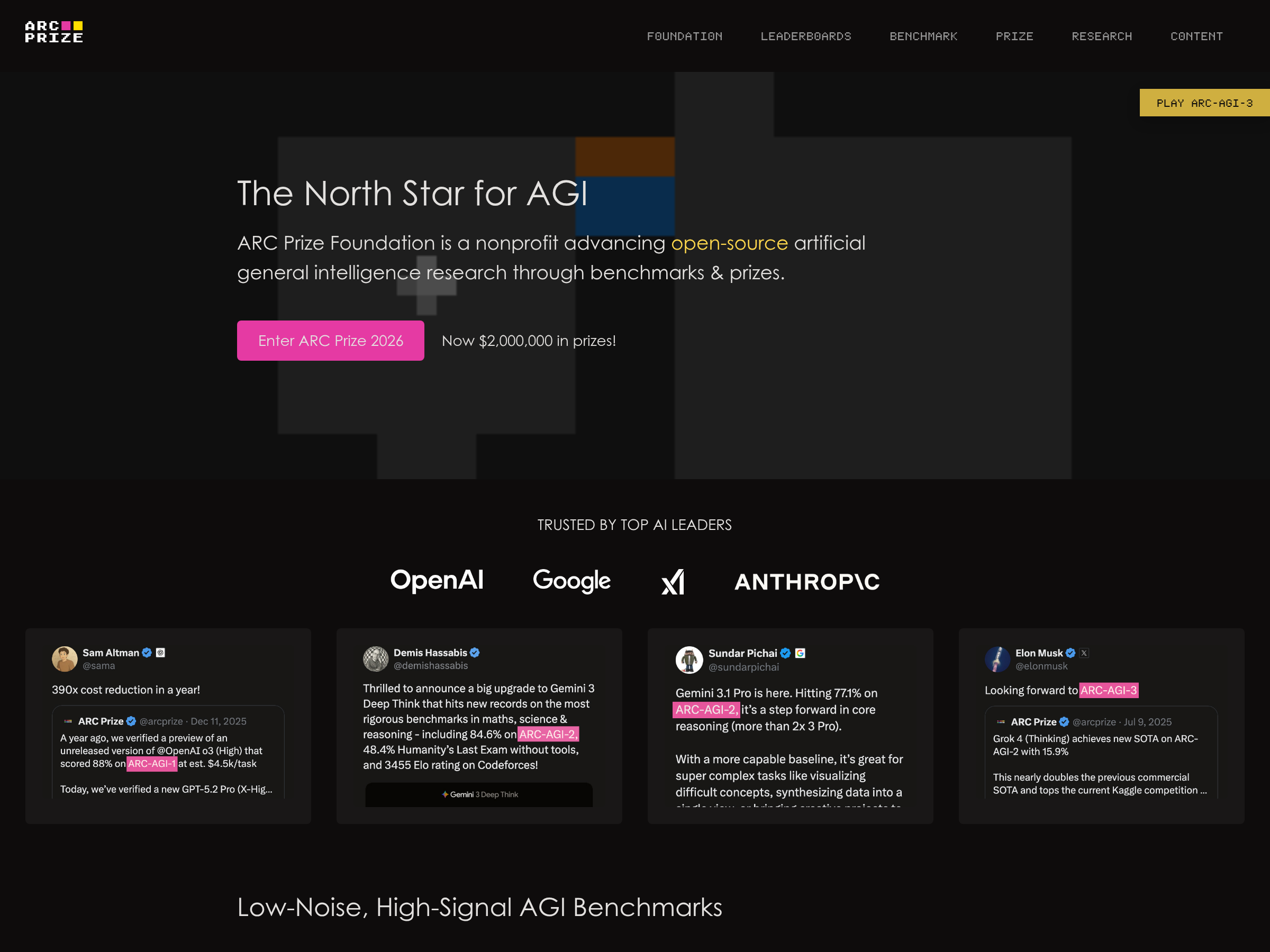 Official site for the ARC Prize competition and ARC-AGI benchmark, focused on measuring and advancing general reasoning in AI.