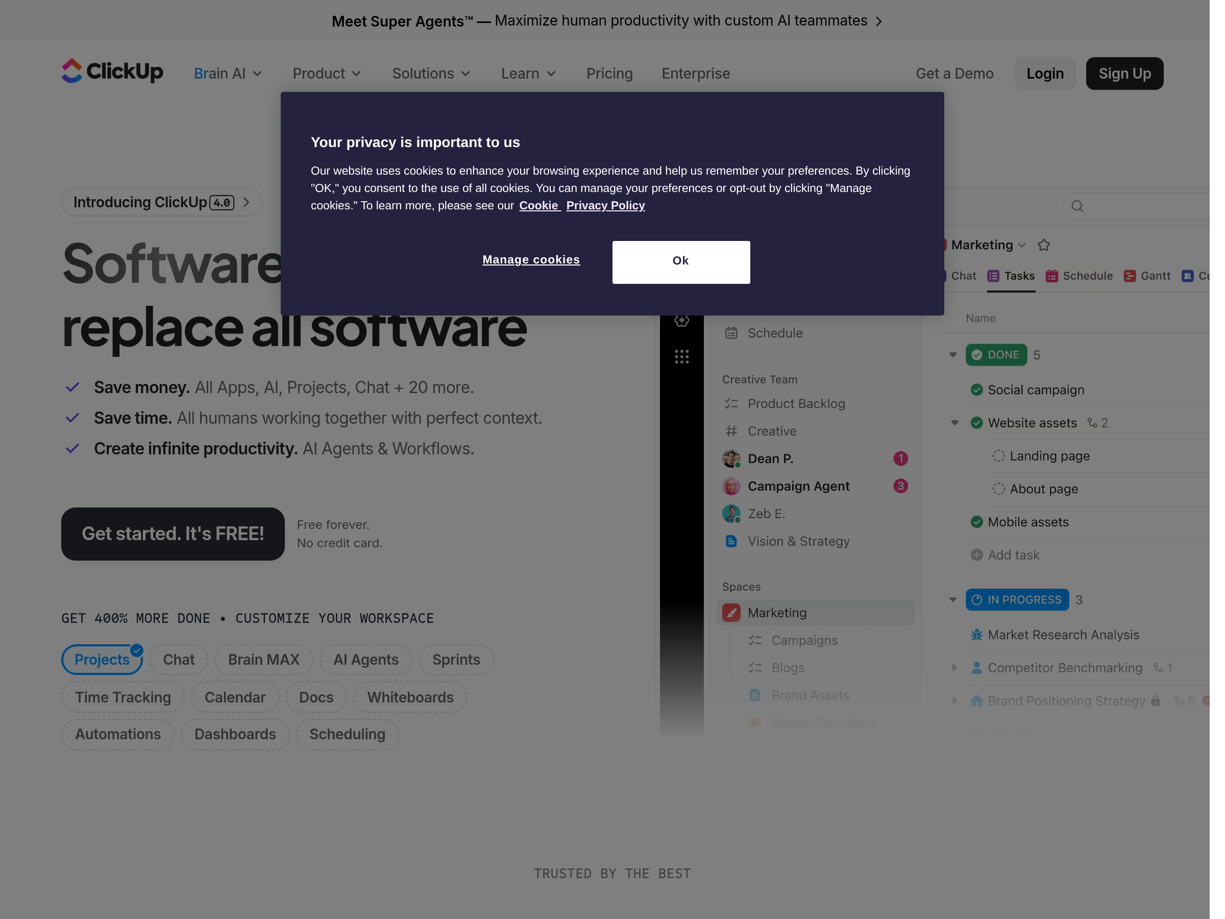 All-in-one work management and productivity platform for tasks, docs, goals, dashboards, automations, chat, and AI-assisted collaboration.