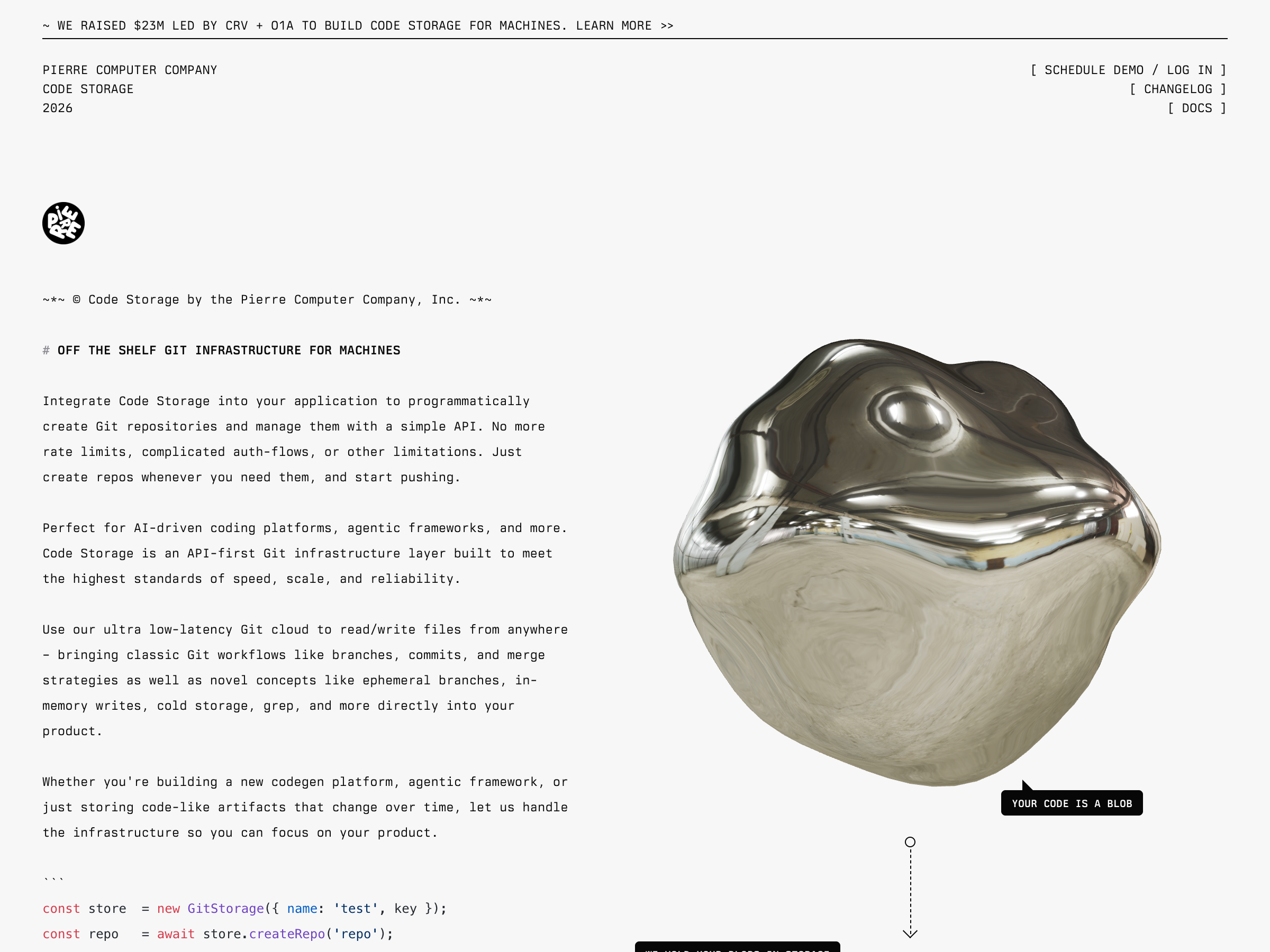 API-first Git infrastructure from the Pierre Computer Company. Product builders can programmatically create and manage Git repositories via SDKs in TypeScript, Python, and Go, expose native clone/push/fetch endpoints inside their own apps, and use primitives like ephemeral branches, in-memory writes, grep, and a GitHub sync engine. Priced per-GB across warm and cold storage tiers for the demands of AI-driven coding platforms and agentic frameworks.