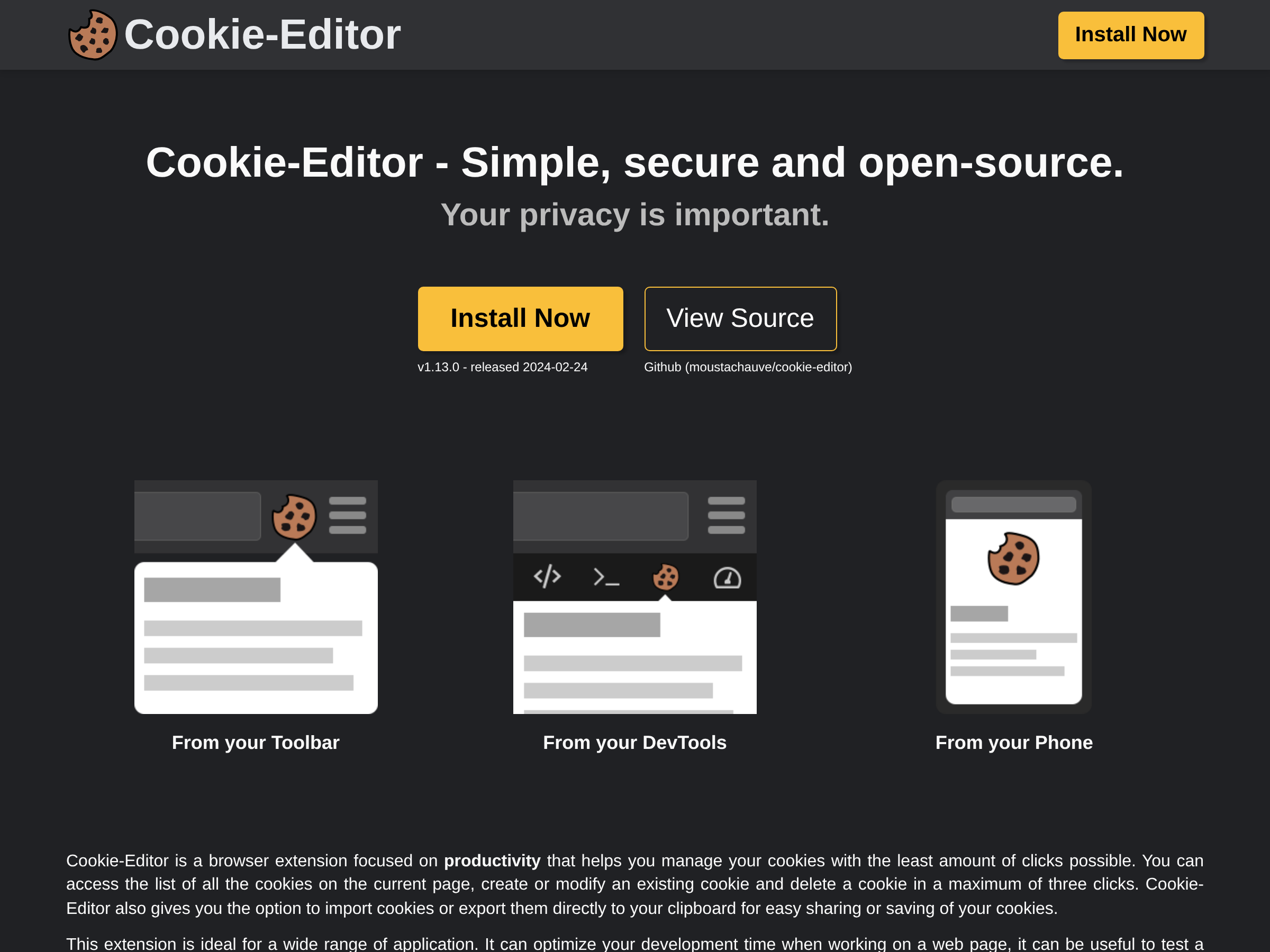 Browser extension for viewing, adding, editing, deleting, importing, and exporting browser cookies.