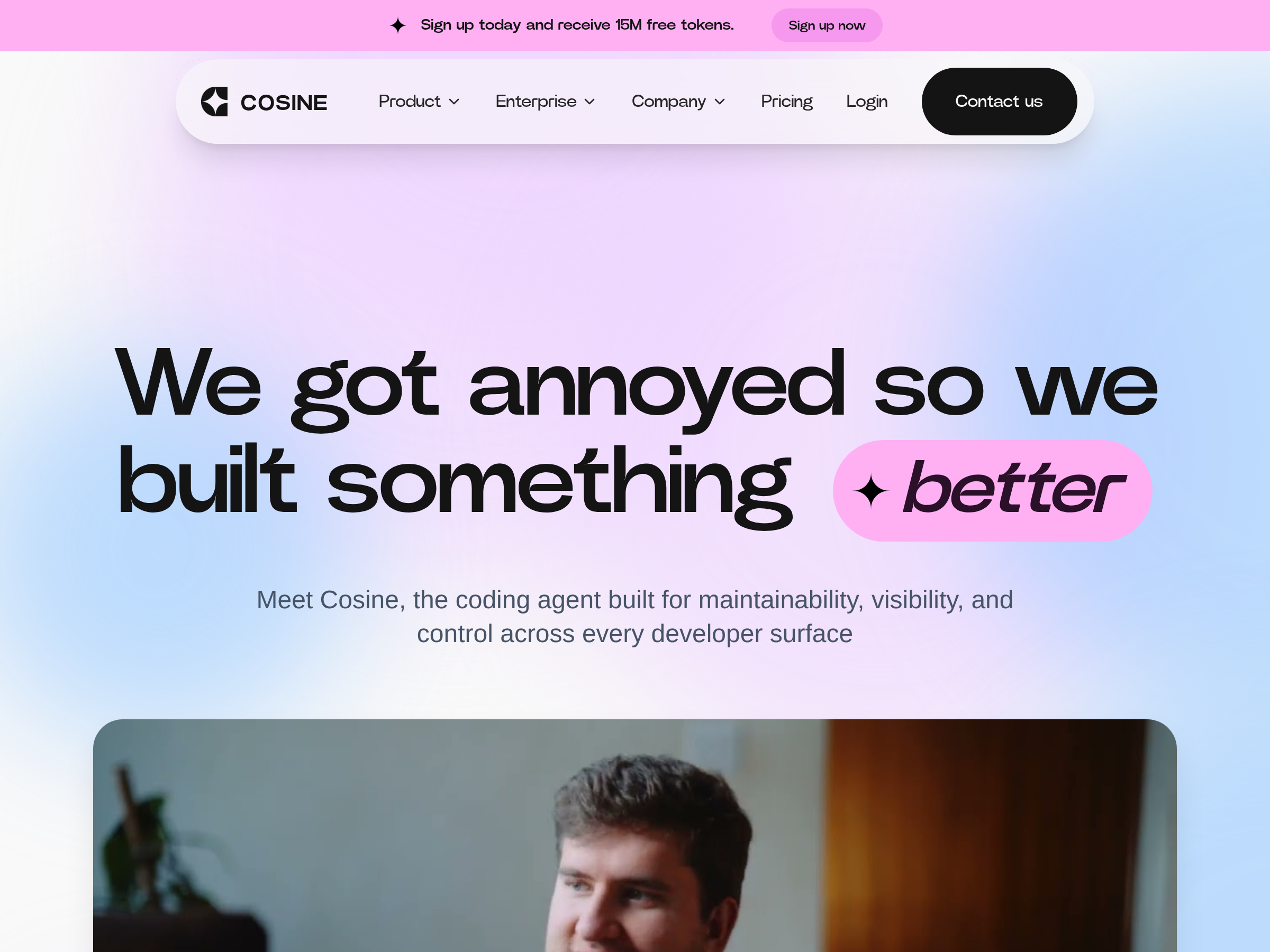 Cosine is a coding agent that ships across three surfaces — a CLI in your terminal, a native macOS desktop app, and a cloud runner for isolated task execution — with shared codebase awareness and a visibility-first UX. The underlying agent (Genie) is known for topping SWE-Bench at launch and is pitched at engineers who want autonomous task execution without the "slop" — plus enterprise teams who need VPC, on-prem, or air-gapped deployments. Paid product with self-serve and enterprise tiers; VS Code extension also available.