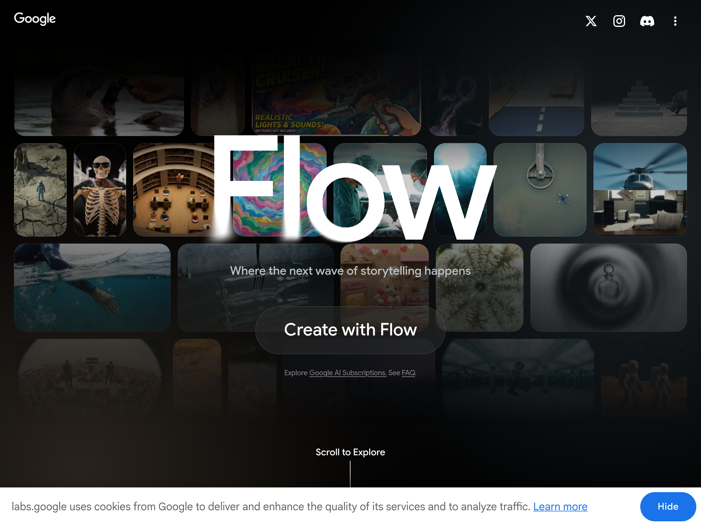 Google's AI filmmaking tool for creating cinematic scenes and clips from prompts, images, and video assets.