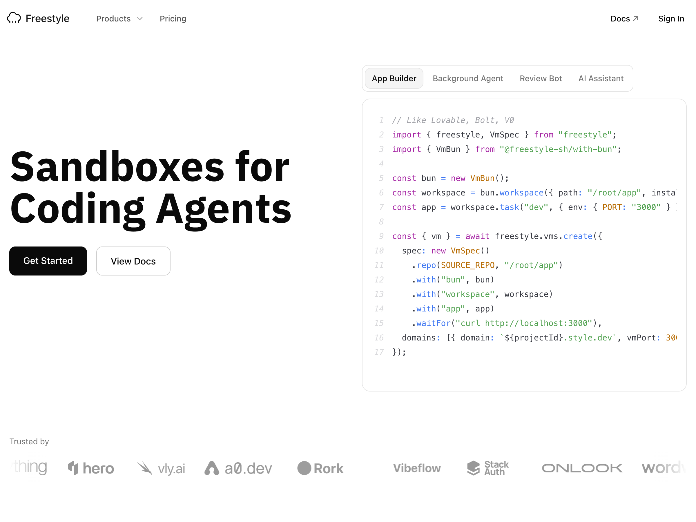 Freestyle is unified infrastructure for AI-generated code — Git repos, full Linux VMs (not containers), deployments, and code execution behind one API. VMs provision in under 600ms, support live forking, pause/resume, nested virtualization, and bidirectional GitHub sync. Pitched at AI app builders (customers include vly.ai, Rork, Vibeflow) and agent platforms running tens of thousands of sandboxed workloads.