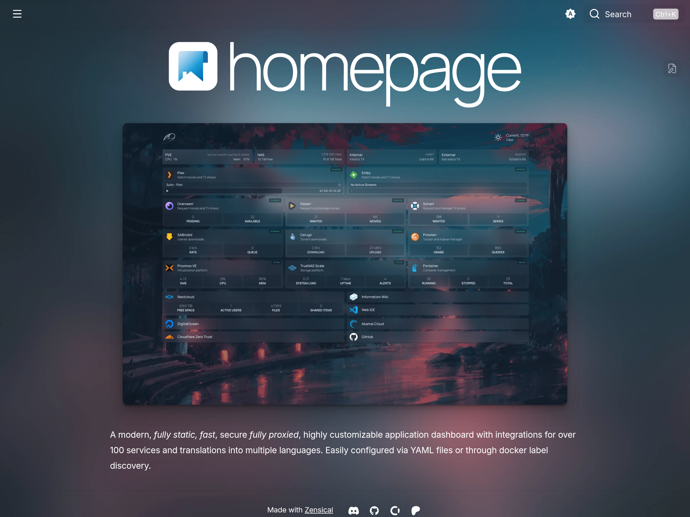 Open-source self-hosted dashboard for aggregating links, widgets, and service status in one homepage.