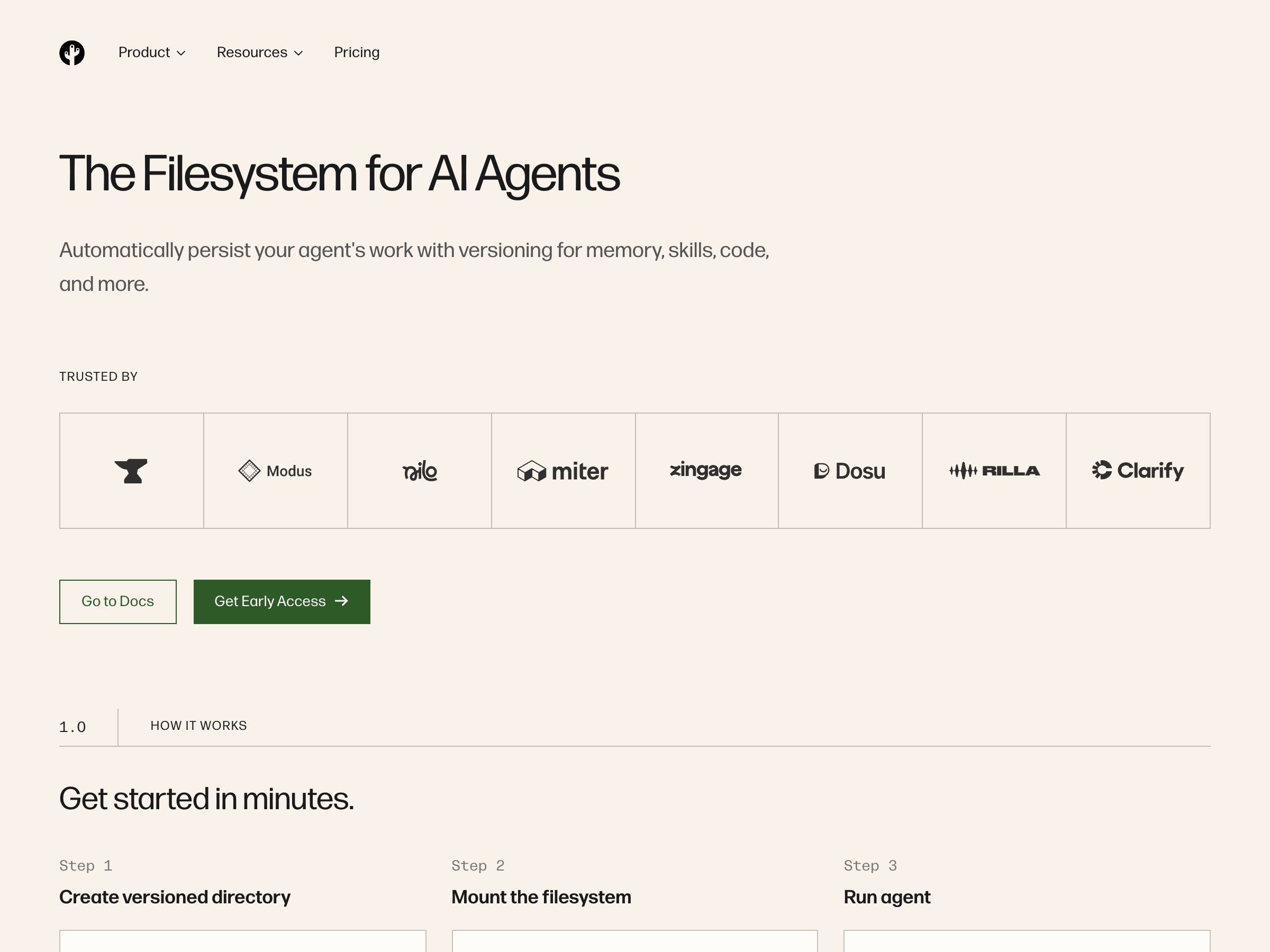 Mesa is a versioned virtual filesystem purpose-built for AI agents — mount a Git-compatible, durable workspace at `/mnt/...` and every write is automatically persisted with sub-50ms API latency. Agents get instant forks, branching for parallel exploration, checkpointing and time-travel, skills versioning, and memory that survives across sessions. SOC 2 Type II with bring-your-own-cloud deployment for enterprise. Use cases span coding agents, personal assistants, sandbox/VM infrastructure, prompt-to-app builders, and data-analysis agents.