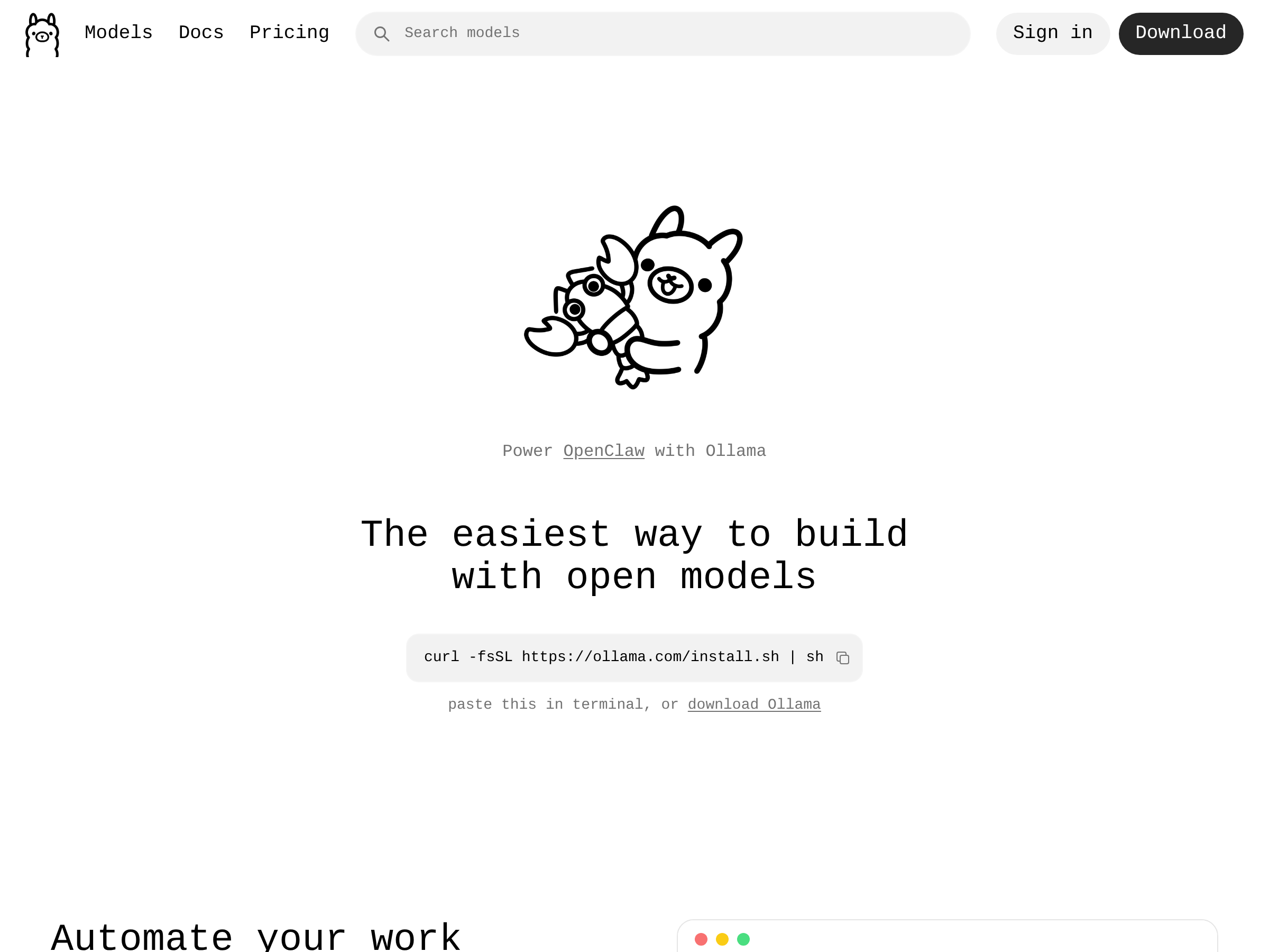Software for running large language models locally, with model download/management and an API/CLI for local inference.